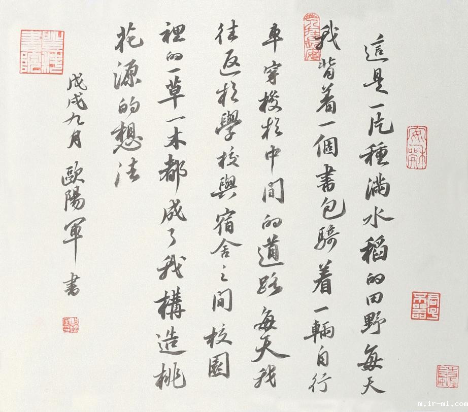 学校对书法组学生要求举办个人的作品展。“心中的桃花源”便由此而生,每天我骑着自行车穿梭于教室与宿舍之间,途经道路两边都是种满水稻的田地,我看着它们由一片泥泞的灰土到金黄的稻穗长成,每当下课,我喜欢一个人坐在稻田边上看着夕阳西下,余晖布满天空,三两个农民还在田地里劳作,麻雀声在耳边环绕,看他们忙碌的身影还有电线杆上跳着舞姿的鸟儿,而我却可以漫无边际地暇想着学习生活中的各种事情,因为这条道路深藏着我的各种喜怒哀乐,我在这里欢呼雀跃过,也在这里咆哮悲伤流过泪。对于我来说,这里的节奏很慢,慢得似乎不知道做事该如何下手,而我的性格似乎又极易冲动,貌似形成了鲜明的对比,几个晚上我会躺在宿舍楼下与月亮对影,必然少不了台湾啤酒的陪伴。 在这里,我会用笔来记录我每天的心情,有我的听课笔记,有每位老师话语中对于我的影响,有读书的日记,也有出行的趣事,这些东西都是“心中桃花源”的一部分。第二年,我到中央财经书法系交换学习,老师和同学的关照都让我倍受感动,更信真情的存在。北京的节奏很快,环境的影响让你不敢懈怠放松,在习书的过程中我注重内心的体会,无论是临摹还是创作,我最喜欢享受的是那种竭尽全力专注的感觉,孙过庭在书谱中提出五乖五合,而在这次作品的准备中我更多注重的是内心情感的抒发,都是在不同情绪下于纸上的一种宣泄,每一张作品的书写过后都让我能够清楚地认识到自己所存在的问题,技进乎道,注重的是字外工夫,我喜欢追求淡然的文意表达,喜欢宋人尚意的精神,意趣是我对于书法的追求,如天然之妙有,一切的文质彬彬和安澜的创作状态是我的理想,而这一切也需要有技术作为基础。二者相辅而成,技术的基本功源自于线条和点画间的日积月累,同样需要有工匠之精神,如切如磋如琢如磨,这些都还有待提高。